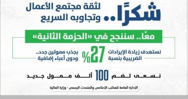 وقال الوزير، في مؤتمر صحفي،: شكرًا.. لثقة مجتمع الأعمال وتجاوبه السريع والقوي في الحزمة الأولى للتسهيلات الضريبية.. ومعًا سننجح في الحزمة الثانية، موضحًا أننا نستهدف زيادة الإيرادات الضريبية بنسبة 27٪ من خلال جذب ممولين جدد طواعية ودون أعباء إضافية، ونتطلع لضم 100 ألف ممول جديد للنظام الضريبي المبسط والمتكامل بحوافز وتسهيلات غير مسبوقة.