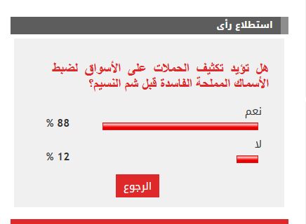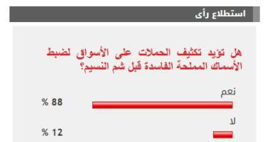 وأيد 88% من القراء مطالب تكثيف الحملات على الأسواق لضبط الأسماك المملحة الفاسدة قبل شم النسيم ، بينما عارض 12% من القراء موضوع الاستطلاع.