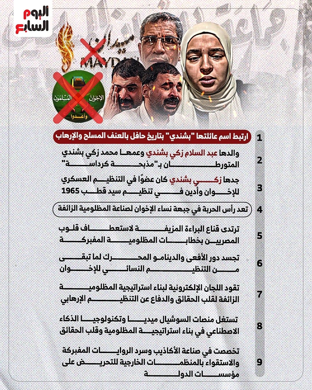 على مدار أكثر من 60 عامًا، ارتبط اسم عائلة "بشندي" بتاريخ حافل بالعنف المسلح والإرهاب. فبين الماضي الممتد لعقود، والحاضر الذي انهارت فيه الجماعة الإرهابية، ظهرت "زينب بشندي" زوجة الإرهابي علي عبد الونيس، كحلقة جديدة في سلسلة العنف الدموي لعائلتها الإجرامية، مرتدية قناع البراءة المزيفة لاستعطاف قلوب المصريين بخطابات المظلومية المفبركة وترسيخ دور الضحية في الأذهان. بينما حقيقتها تكمن في سجل عائلتها الأسود الملطخ بالإرهاب.