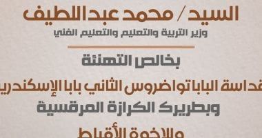 يتقدم محمد عبد اللطيف وزير التربية والتعليم والتعليم الفني بخالص التهنئة لقداسة البابا تواضروس بابا الإسكندرية وبطريرك القداسة المرقسية والإخوة الأقباط بمناسبة حلول عيد القيامة المجيد راجيا المولى عز وجل أن يعيد هذه المناسبة الغالية على قداسته بموفور الصحة والعافية وعلى مصر وشعبها العظيم بمزيد من المحبة والسلام.