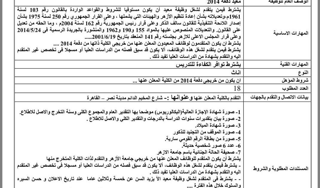 يشترط أن يكون المتقدم للوظائف المعلن عنها من خريجي جامعة الأزهر والتقدم لذات الكلية المتخرج منها