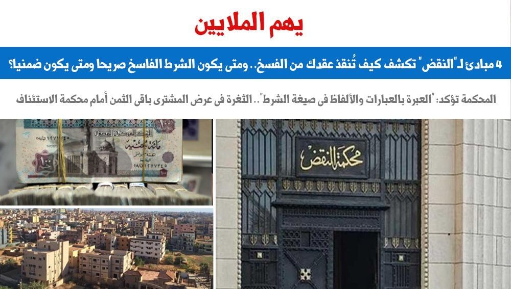 يهم الملايين.. 4 مبادئ للنقض تكشف كيف تُنقذ عقدك من الفسخ.. ومتى يكون الشرط الفاسخ صريحا ومتى يكون ضمنيا؟.. تؤكد: العبرة بالعبارات والألفاظ فى صيغة الشرط.. الثغرة فى عرض المشترى باقى الثمن أمام محكمة الاستئناف
