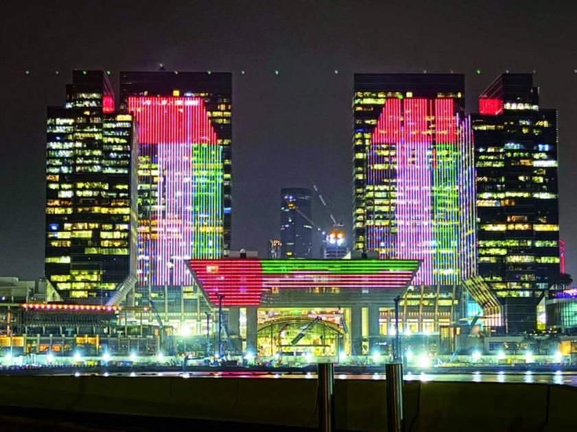 وتزينت أبراج العاصمة ودبي وكل الإمارات بألوان العلم، فيما ظهرت الواجهات الزجاجية لعدد من المباني وكأنها ترفع العلم بطريقة مختلفة، عبر الإضاءة التي غطت الطوابق من أعلاها إلى أسفلها، في رسالة بأن علمنا حكاية وطن نسجت بخيوط من ذهب.