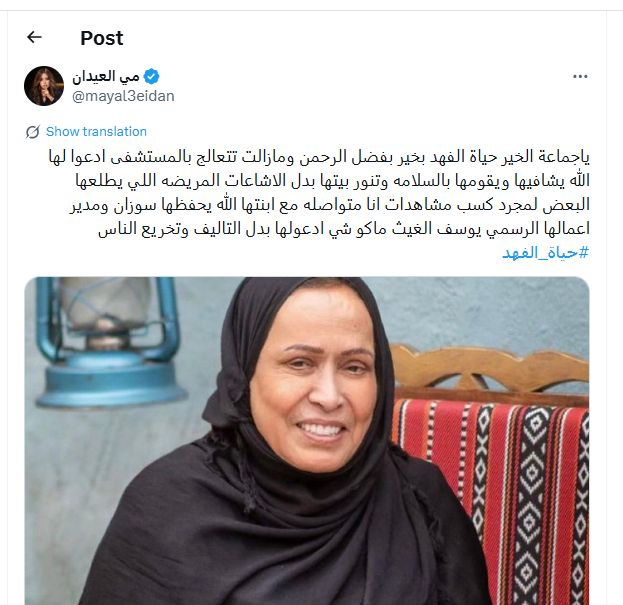 نفت الإعلامية الكويتية مي العيدان ما تردد خلال الساعات الأخيرة بشأن وفاة النجمة الكويتية حياة الفهد ، مؤكدة أن هذه الأنباء عارية تماماً من الصحة. وأوضحت العيدان أن حياة الفهد لا تزال على قيد الحياة وتتلقى العلاج داخل أحد المستشفيات، مطالبة الجمهور بالدعاء لها بالشفاء العاجل بدلاً من تداول الشائعات.