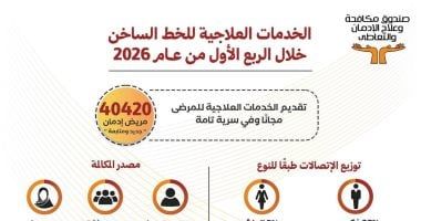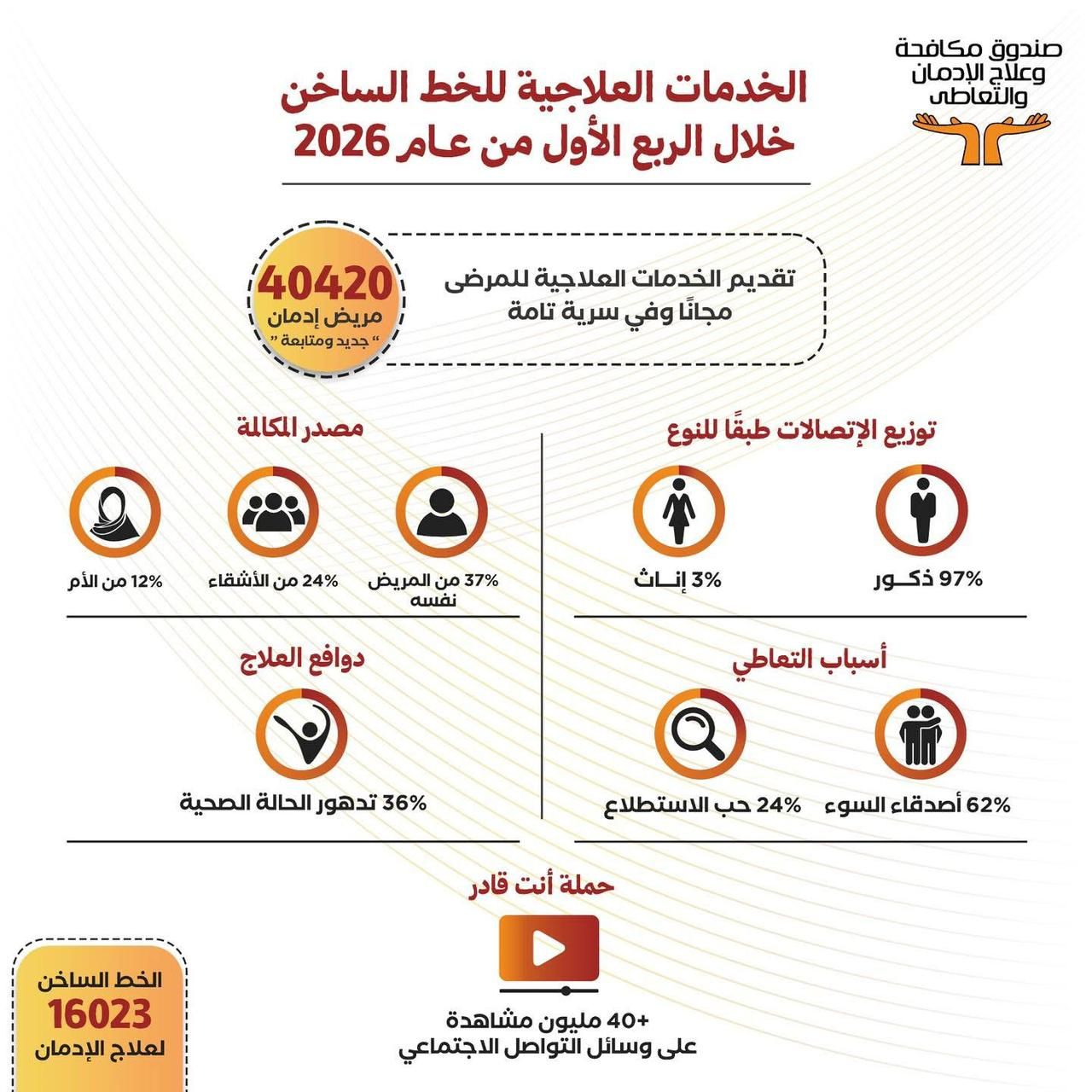 نشر صندوق مكافحة وعلاج الإدمان والتعاطي إنفوجرافا على الصفحة الرسمية للصندوق عن مجهودات الخط الساخن للصندوق "16023"، خلال الربع الأول من عام 2026 ،حيث تم تقديم الخدمات العلاجية لعدد 40420 مريض "جديد ومتابعة"، كما يتم توفير الخدمات العلاجية لأى مريض إدمان من أبناء المناطق المطورة "بديلة العشوائيات" "الأسمرات، المحروسة، روضة السودان، روضة السيدة، أهالينا، الخيالة، بشاير الخير، حدائق أكتوبر"، وتنوعت الخدمات ما بين مكالمات للمتابعة والمشورة والعلاج والتأهيل والدمج المجتمعي، حيث إن الخدمات العلاجية تقدم للمرضى مجاناً ووفقا للمعايير الدولية، وبلغت نسبة المستفيدين الذكور من هذه الخدمات 97 % بينما بلغت نسبة الإناث 3%، حيث تردد المرضى على المراكز العلاجية التابعة للصندوق والشريكة مع الخط الساخن وعددها 35 مركز بـ 20 محافظة حتى الآن.