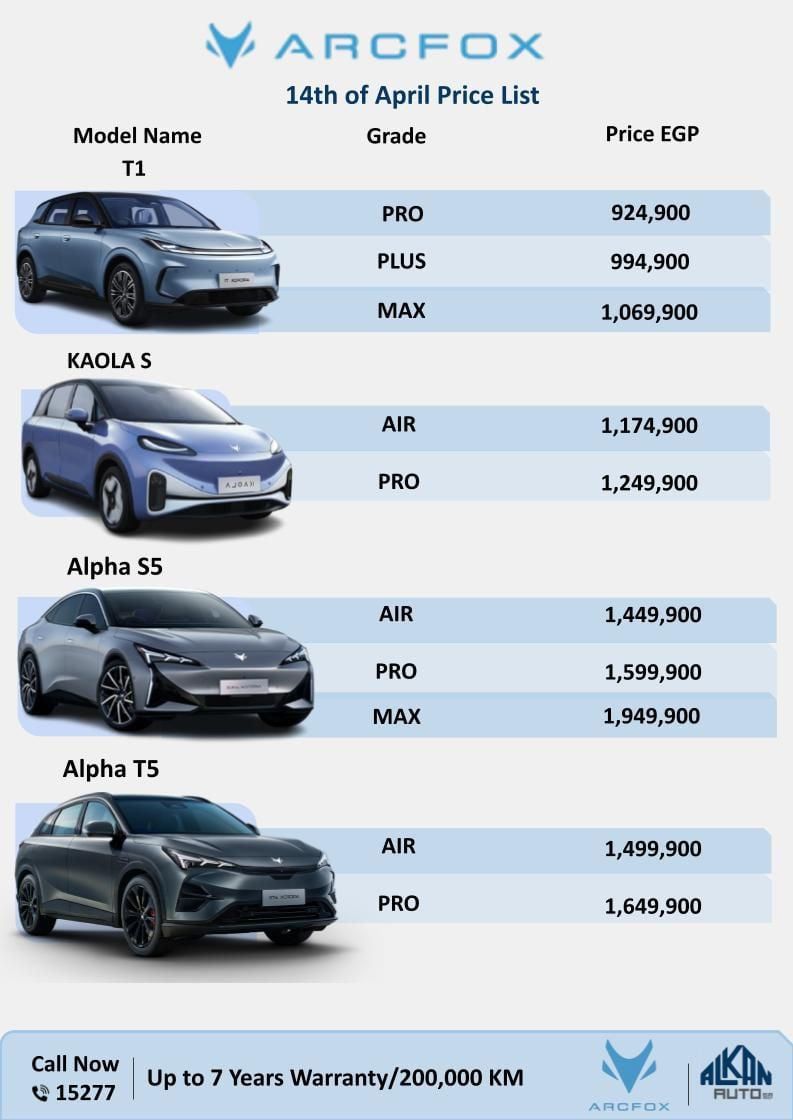 الأحد، 12 أبريل 2026 03:11 مكشفت شركة ألكان أوتو الوكيل الرسمي لعلامة "أرك فوكس" الكهربائية عن أحدث قائمة سعرية لطرازاتها المتنوعة بزيادات تصل إلي 70 ألف جنيه، وإليكم أبرز التفاصيل وهي كالآتي: