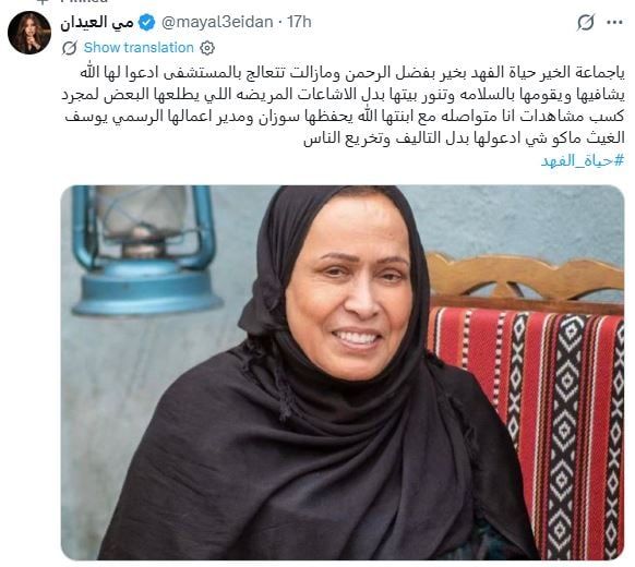 نفت الإعلامية الكويتية مي العيدان ما تردد خلال الساعات الأخيرة بشأن وفاة النجمة الكويتية حياة الفهد، حيث كتبت عبر حسابها على "إكس": "يا جماعة الخير حياة الفهد بخير بفضل الرحمن وما زالت تتعالج بالمستشفى ادعوا لها الله يشفيها ويقومها بالسلامة وتنور بيتها بدل الأشعات المريضة اللي يطلعها البعض لمجرد كسب مشاهدات، أنا متواصلة مع ابنتها الله يحفظها سوزان ومدير أعمالها الرسمي يوسف الغيث، ادعو لها بدل التأليف وتخريع الناس".