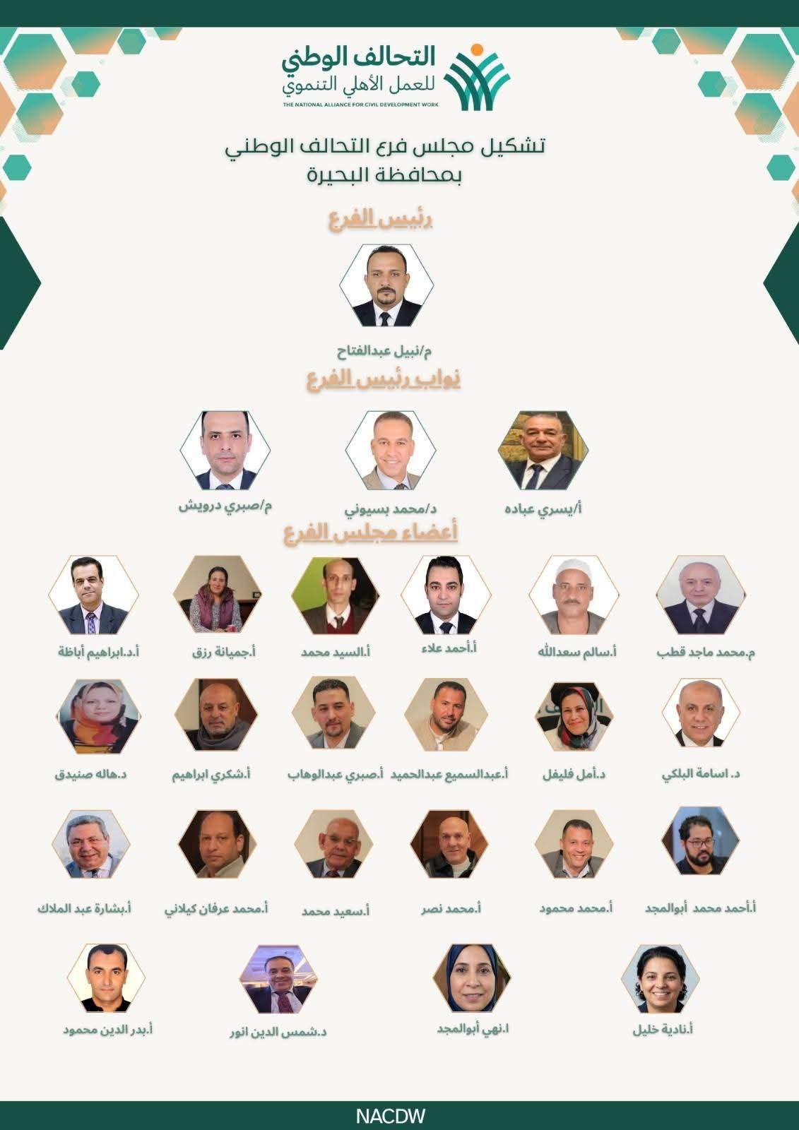 ويضم التشكيل الكامل لمجلس الفرع كلاً من السادة: إبراهيم محمد كمال عبدالواحد اباظه، محمد ماجد عوض قطب حميده، أمل مختار احمد فليفل، شمس انور شمس الدين مصطفى، بشاره عبدالملك بشاره عبدالمسيح، هاله احمد السعيد محمد كامل صنيدق، محمد عرفان كيلاني، عبد السميع عبد الحميد (شعبان الاقرع)، سالم الخويلدي، أسامة سليمان عبدالفتاح البلكي، احمد علاء الدين أحمد الشابوري، أحمد محمد أبو المجد، صبري عبدالوهاب رزق، جميانة رزق شوقي ميخائيل، شكري إبراهيم محمود حبشي، السيد محمد رجب، نادية خليل دميان خليل، نهي محمد محمود، بدر الدين محمود محمد مفتاح سليمان، محمد نصر محمد يوسف البياع، محمد محمود علي السيد عبدالخالق سعد، وسعيد محمد بسيوني عبداللطيف، وذلك لضمان بناء هيكل إداري قوي وقيادة مؤسسية قادرة على إدارة وتنسيق المشروعات المشتركة بكفاءة وفاعلية وتوزيع الأدوار بما يخدم أهداف التحالف.