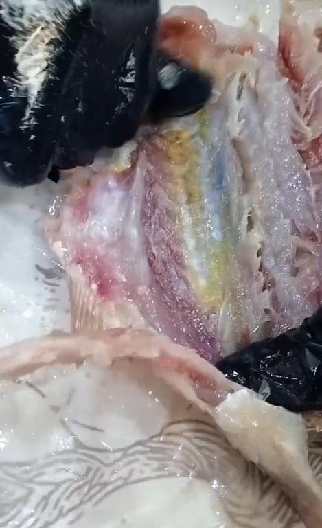 3- يمكن التنظيف باستخدام مقصاً لفتح السمكة من الجنب وإزالة المصارين.