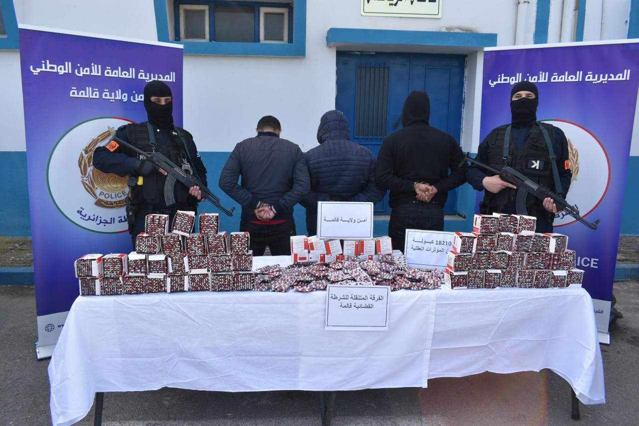 تمكن أفراد الفرقة المتنقلة للشرطة القضائية بقالمة خلال عملية أمنية نوعية من توقيف جماعة إجرامية تتكون من 5 أفراد ينحدرون من ولايتي قالمة والوادي. تتراوح أعمارهم بين 31 و 39 سنة، كانوا بصدد نقل كمية معتبرة من المؤثرات العقلية بحي عين قرقور بقالمة.