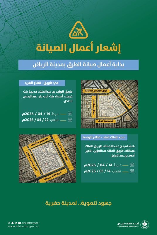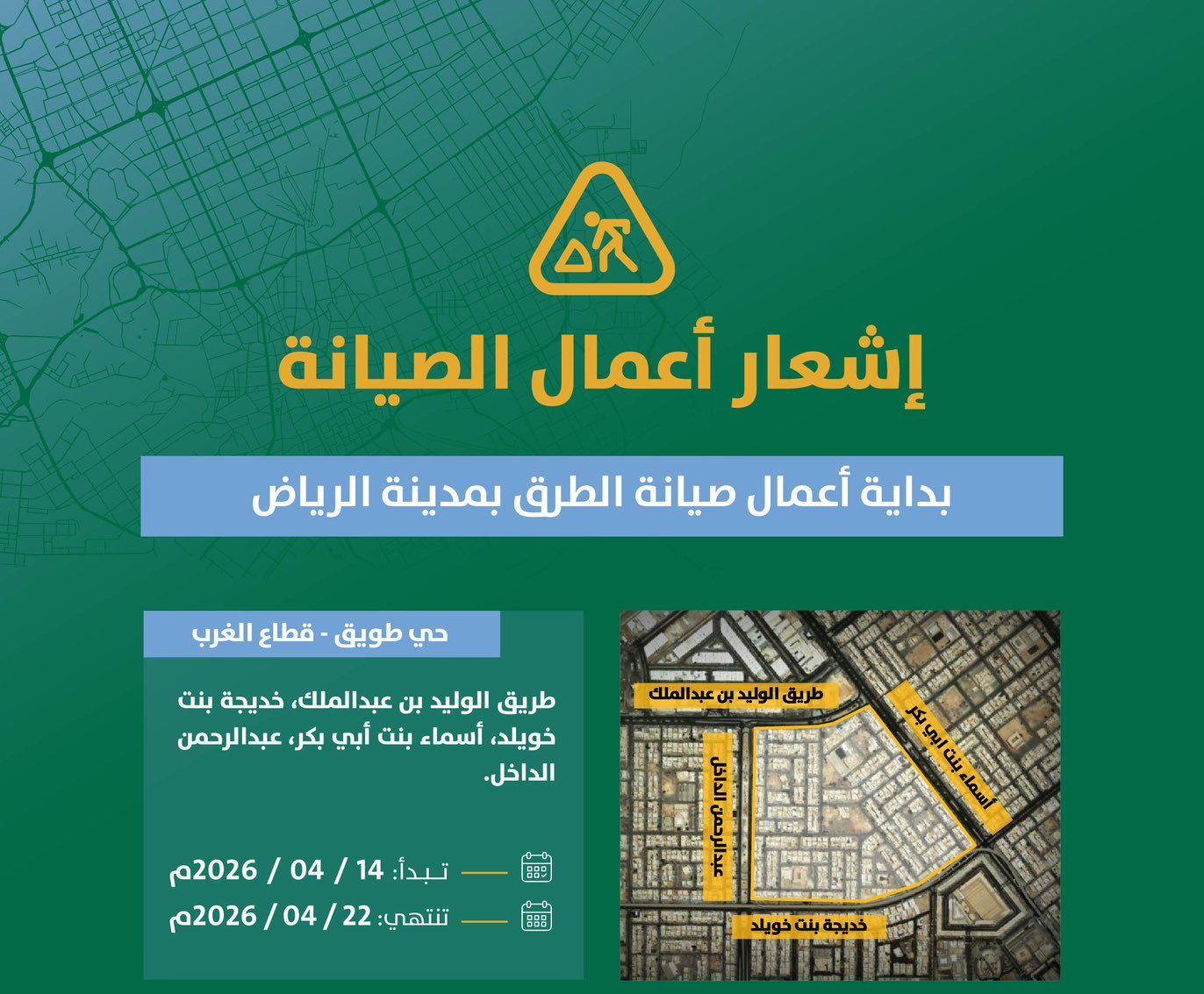 وبحسب ما ذكرت أمانة الرياض عبر منصة إكس، تشمل أعمال الصيانة في حي طويق، طريق الوليد بن عبدالملك، وشارع خديجة بنت خويلد، وشارع أسماء بنت أبي بكر، إلى جانب عدد من الطرق الداخلية في الحي، وذلك ابتداءً من يوم غدٍ الثلاثاء الموافق 14 أبريل 2026، على أن تستمر حتى 22 أبريل 2026.