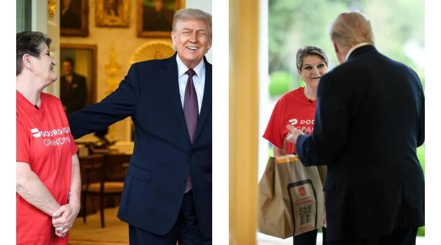 ووصلت الوجبة عبر عاملة من منصة التوصيل المحلية «دور داش»، ارتدت قميصاً يحمل عبارة «DoorDash Grandma»، في لقطة حرص البيت الأبيض على توثيقها ونشرها عبر مقطع فيديو رسمي على إنستغرام.