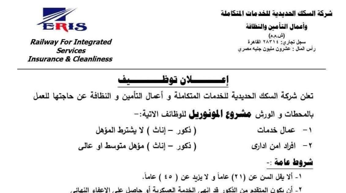 إعلان توظيف تعلن شركة السكك الحديدية للخدمات المتكاملة وأعمال التأمين والنظافة عن حاجتها للعمل بالمحطات و الورش مشروع المونوريل للوظائف الاتية :-
