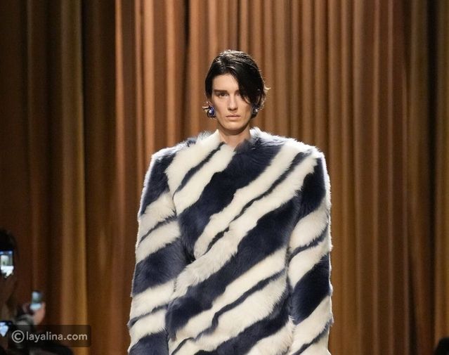 - رغم الطابع العسكري الواضح لبعض التصاميم، لم تغب العناصر الأكثر سيولة وأنوثة، فقد ظهرت فساتين مصنوعة من قماش اللاميه المطوي، الذي يعكس الضوء بطريقة تمنح الإطلالات حركة ديناميكية.