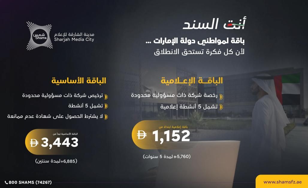تقدّم الباقة مجموعة من حلول التراخيص المصممة خصيصاً لمواطني دولة الإمارات، بما يوفر مسارات مرنة تتماشى مع مختلف احتياجات الأعمال وأنواع الأنشطة. وتشمل العروض باقة الإعلام التي تبدأ من 5,760 درهماً لمدة خمس سنوات (بما يعادل 1,152 درهماً سنوياً)، وتوفّر رخصة شركة ذات مسؤولية محدودة تشمل ما يصل إلى خمسة أنشطة إعلامية. كما تتضمن الباقة الأساسية التي تبدأ من 6,885 درهماً لمدة سنتين (بما يعادل 3,443 درهماً سنوياً)، وتُمنح أيضاً كرخصة شركة ذات مسؤولية محدودة وتتيح ما يصل إلى خمسة أنشطة تجارية.