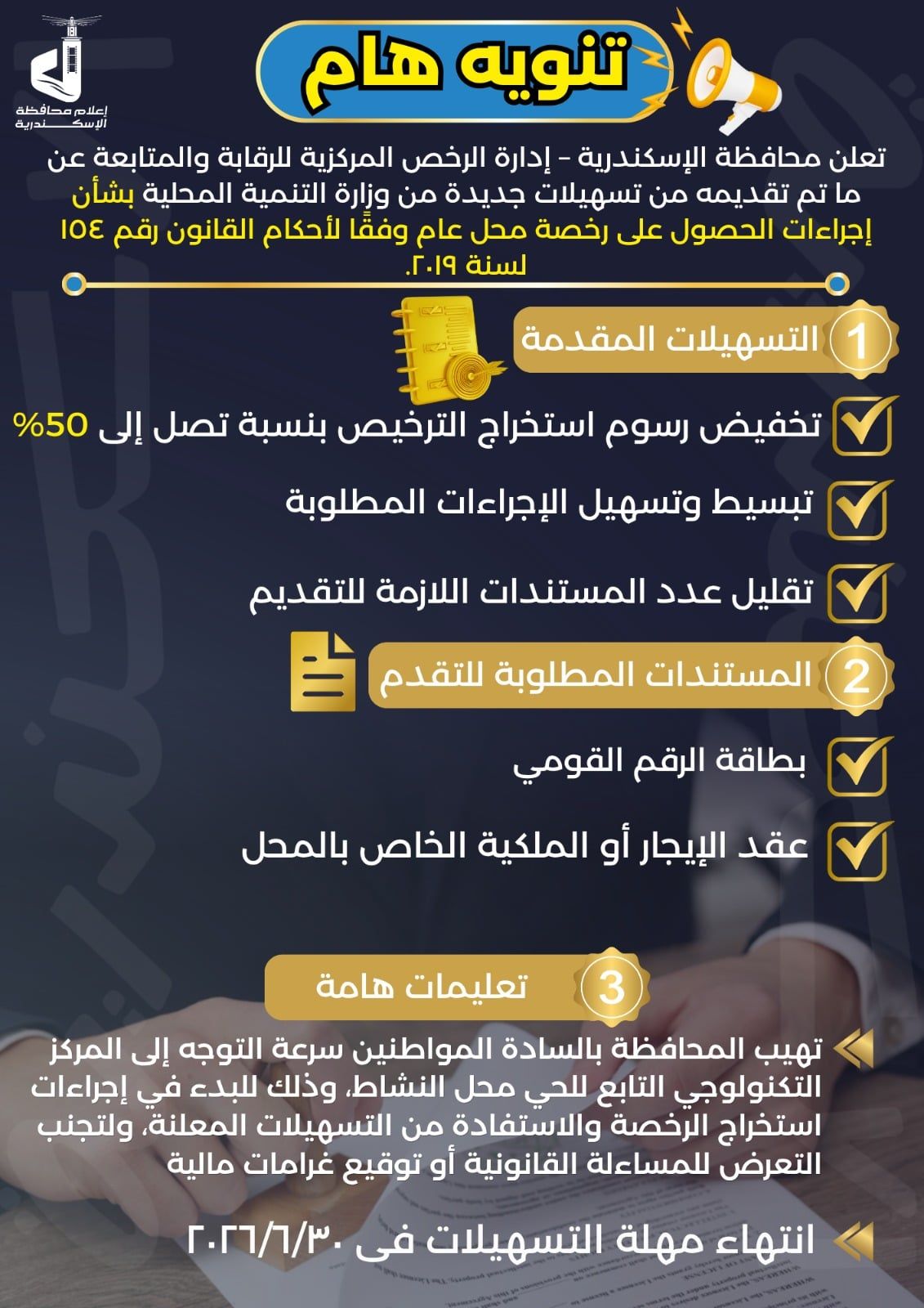 وتؤكد محافظة الإسكندرية أنه تم تخفيض رسوم استخراج الترخيص بنسبة تصل إلى 50% ، إلى جانب تبسيط الإجراءات وتقليل عدد المستندات المطلوبة، بما يساهم في سرعة إنهاء المعاملات. علما بأن انتهاء مهلة التسهيلات 30 يونيو 2026.