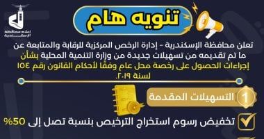 كما تهيب محافظة الإسكندرية بأصحاب المحال العامة سرعة التوجه إلى المركز التكنولوجي بالحي المختص لبدء إجراءات الترخيص والاستفادة من التسهيلات الجديدة، تفاديًا للتعرض لأي مخالفات أو غرامات قانونية.