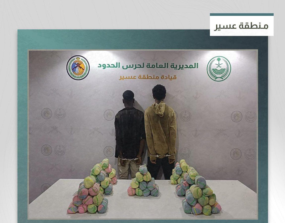 قبضت الدوريات البرية لحرس الحدود في قطاع الربوعة، بمنطقة عسير، على مخالفين لنظام أمن الحدود من الجنسية الإثيوبية، لتهريبهما 22 كيلوجرامًا من نبات القات المخدر. وجرى استكمال الإجراءات النظامية الأولية بحقهما، وتسليمهما والمضبوطات لجهة الاختصاص.