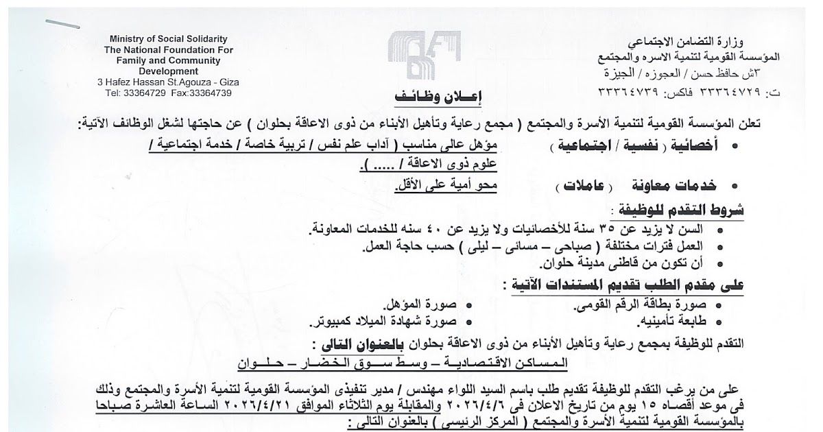 تعلن المؤسسة القومية لتنمية الأسرة والمجتمع عن حاجتها لشغل الوظائف الآتية:
