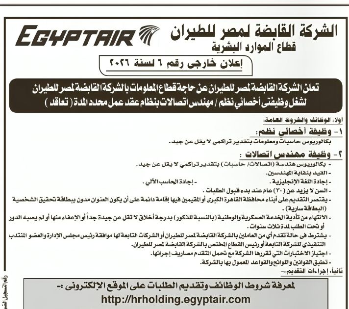 إعلان خارجي رقم (6) لسنة 2026 تعلن الشركة القابضة لمصر للطيران عن حاجة قطاع المعلومات بالشركة القابضة لمصر للطيران لشغل وظيفتي أخصائي نظم / مهندس اتصالات بنظام عقد عمل محدد المدة (تعاقد)