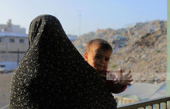 أم تحمل طفل وسط القمامة