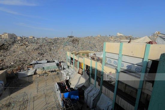 ونقلت وكالة الأنباء الفلسطينية (وفا) تقريرًا مصورًا من مدينة غزة، رصدت فيه واقع إحدى المدارس التي أصبحت ملاذًا للنازحين. يعيش هؤلاء داخل خيام مصنوعة من قماش هش، لا يقيهم برد الشتاء ولا يوفر لهم الحد الأدنى من الأمان، بينما تحيط بهم أكوام النفايات والحشرات نتيجة التلوث المتفاقم.