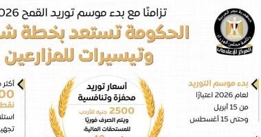 الأربعاء، 15 أبريل 2026 12:07 منشر المركز الإعلامي لمجلس الوزراء إنفوجرافًا عبر منصاته على مواقع التواصل الاجتماعي، استعرض من خلاله استعدادات الحكومة وخطتها الشاملة لاستقبال موسم توريد القمح 2026.
