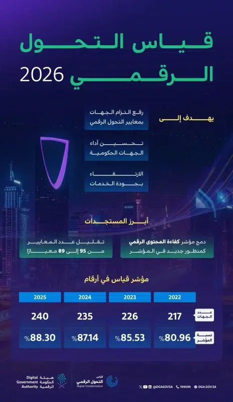ويأتي إطلاق الدورة الجديدة استكمالًا للدورات السابقة، حيث تضمنت النسخة المحدثة من الوثيقة (89) معيارًا مقارنة بـ(95) معيارًا في عام 2025، الذي شهد مشاركة (240) جهة حكومية، وبلوغ نسبة المؤشر (88.30%)، فيما وصلت (26) جهة إلى مرحلة الإبداع في نتائج المؤشر التي تعكس نضج المنظومة الرقمية الحكومية واستمرار تطورها.