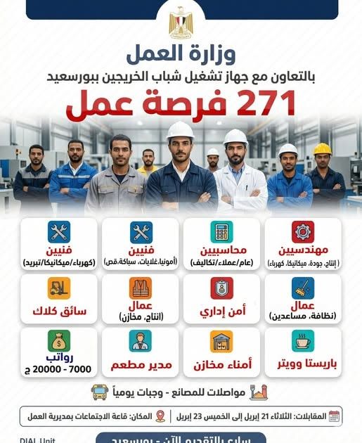 وزارة العمل بالتعاون مع جهاز تشغيل شباب الخريجين ببورسعيد 271 فرصة عمل