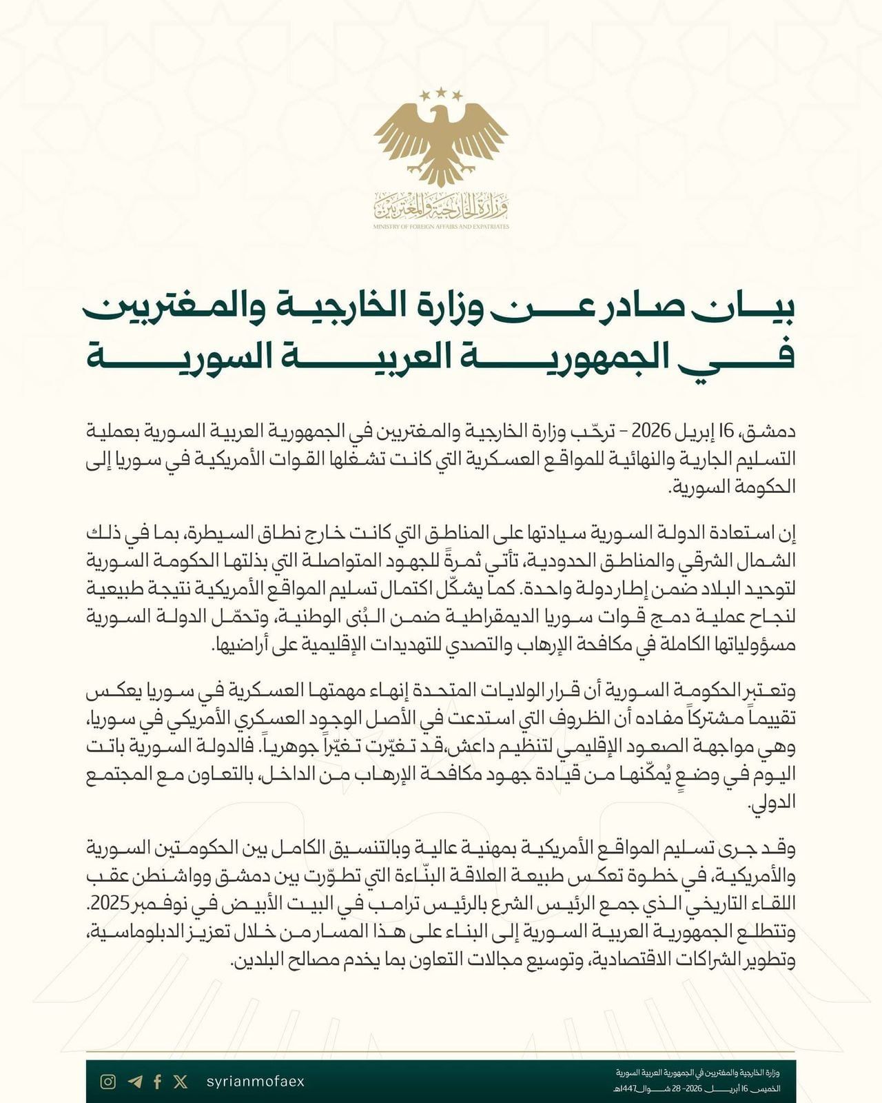 رحبت وزارة الخارجية والمغتربين السورية، بعملية التسليم الجارية والنهائية للمواقع العسكرية التي كانت تشغلها القوات الأمريكية في سوريا إلى الحكومة السورية.