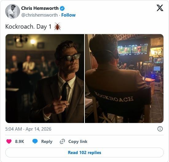 هيمسورث شارك متابعيه عبر منصة X بصورة من كواليس التصوير في أستراليا، ظهر فيها بإطلالة رسمية توحي بشخصية قوية وغامضة، إلى جانب كرسي مخرج يحمل اسم الفيلم، واكتفى بتعليق بسيط: Kockroach. Day 1، في أسلوب مختصر لكنه كفيل بإشعال حماس الجمهور.