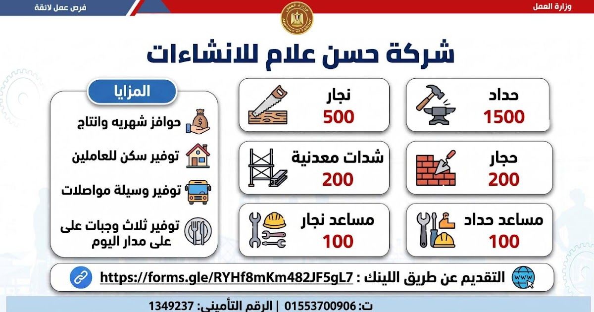اعلان وظائف شركة حسن علام للإنشاءات برعاية وزارة العمل المصرية والتقديم لوظائف شركة حسن علام الكتروني