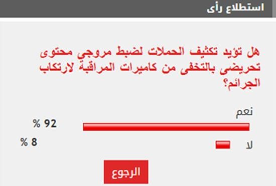 فى استطلاع للرأى طرحه "اليوم السابع" تحت عنوان هل تؤيد تكثيف الحملات لضبط مروجى محتوى تحريضى بالتخفى من كاميرات المراقبة لارتكاب الجرائم؟، أيد غالبية القراء تكثيف الحملات لضبط مروجى محتوى تحريضى بالتخفى من كاميرات المراقبة لارتكاب الجرائم.