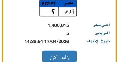 الجمعة، 17 أبريل 2026 01:28 مأعلنت بوابة مرور مصر الإلكترونية، عن مزايدة على لوحة معدنية مميزة للسيارات، وحملت الوحة رقم (أ و س - 2 ) سعرها وصل مليون و400 الف جنيه، و5 أشخاص يزايدون عليها في المزاد.