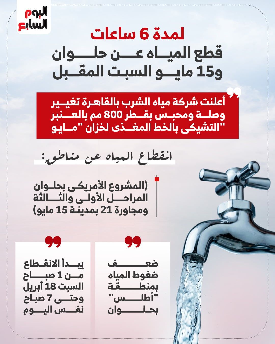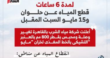 الجمعة، 17 أبريل 2026 05:00 مترفع شركة مياه الشرب بالقاهرة حالة الطوارئ، للبدء في أعمال الصيانة والتحديث الطارئة لمنظومة الشبكات، والتي يترتب عليها قطع مياه الشرب عن عدة مناطق حيوية بحلوان ومدينة 15 مايو، وذلك اعتباراً من الساعات الأولى لصباح غدٍ السبت الموافق 18 أبريل 2026.