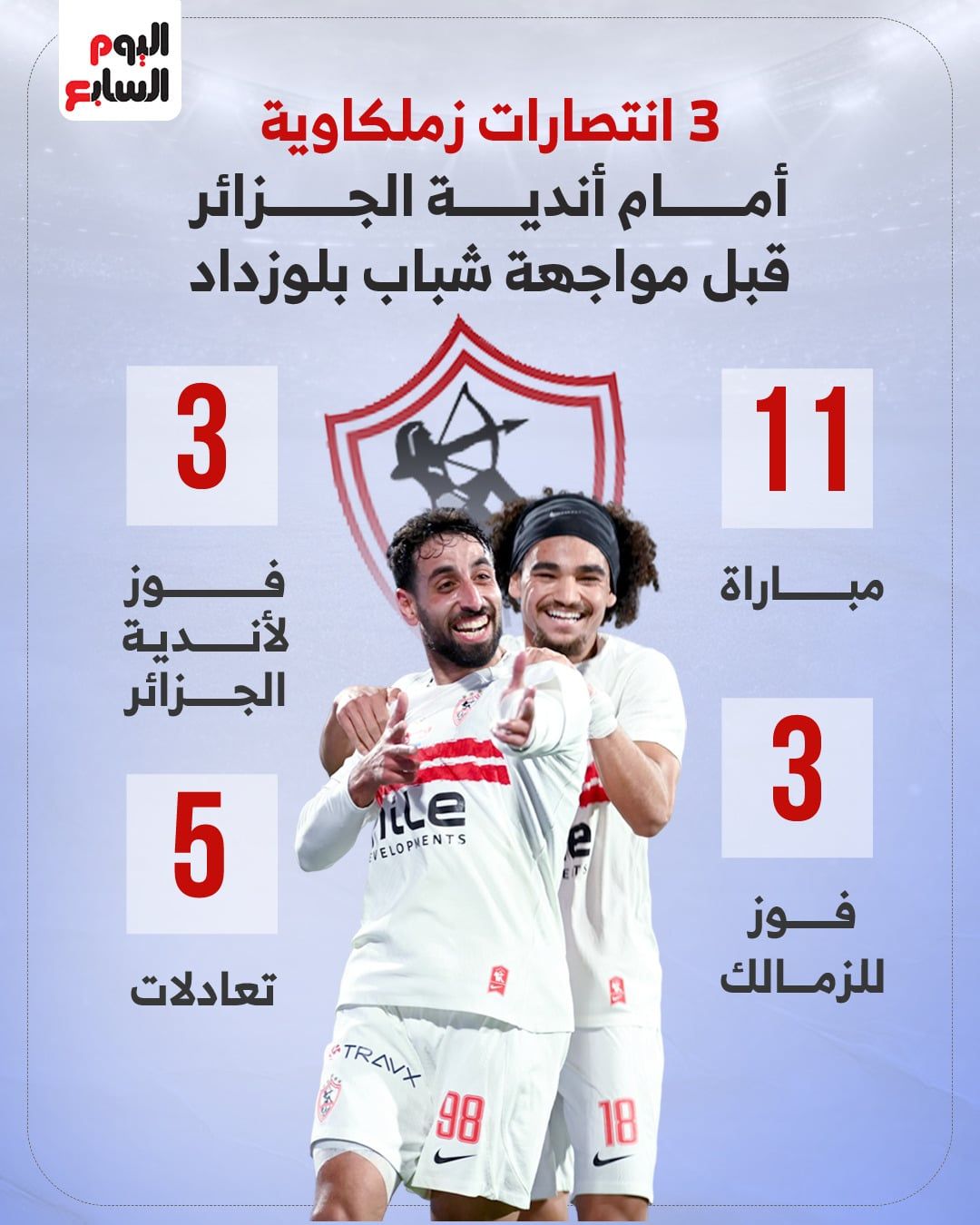 صدام كلاسيكى بين الزمالك وشباب بلوزدادوتمثل مباراة الليلة صداماً كلاسيكياً بين مدرستين كرويتين عريقتين في الشمال الإفريقي؛ إذ يسعى “الفارس الأبيض” لاستغلال خبراته المتراكمة في الأدوار الإقصائية القارية لتحقيق نتيجة إيجابية والصعود لنهائي الكونفدرالية، بينما يطمح “أبناء العقيبة” لرد الاعتبار وتحقيق فوزيصعد بالفريق لنهائي البطولة.
