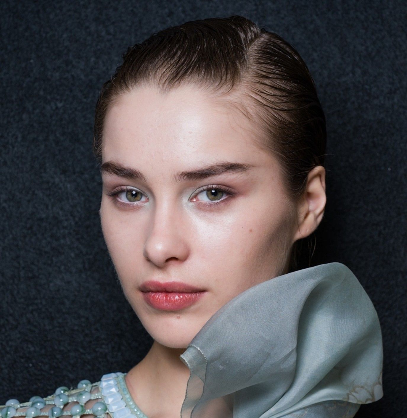 في هذه الإطلالة، تظهر ظلال العيون الباستيلية كلمسة فنية ناعمة تضيف إشراقة مميزة دون أن تسرق الانتباه من جمال الملامح الطبيعي. اللون المستخدم هنا يميل إلى الأخضر النعناعي الفاتح، وهو من أكثر درجات الباستيل أناقة وانتعاشاً؛ حيث يمنح العينين إحساسا بالاتساع والنقاء في الوقت نفسه.