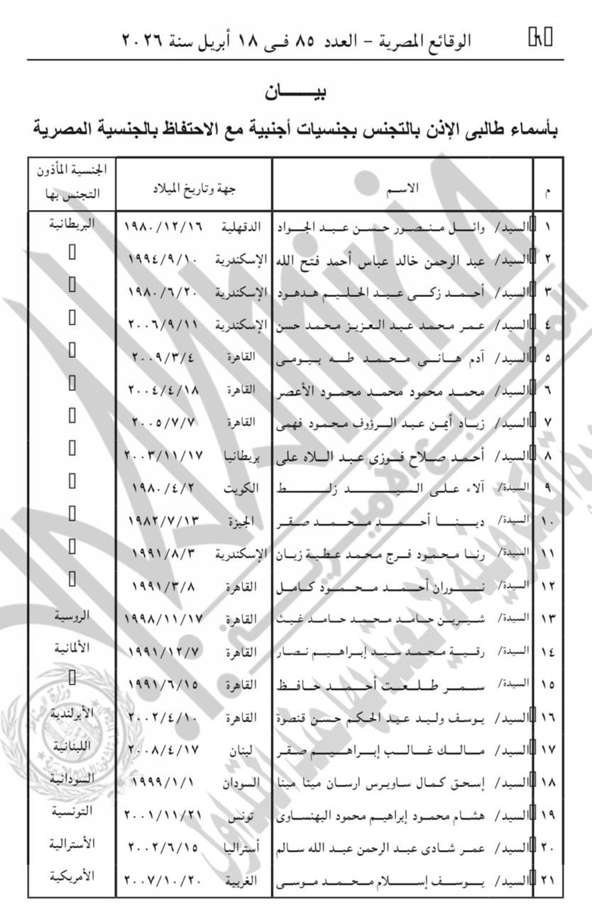 السماح لـ42 مواطنًا بالتجنس بجنسيات أجنبية مع الاحتفاظ بالمصريةوتضمن القرار رقم 507 لسنة 2026 الإذن لـ21 مواطنًا، أولهم وائل منصور حسن عبد الجواد وآخرهم يوسف إسلام محمد موسى، بالتجنس بالجنسية الأجنبية الموضحة قرين اسم كل منهم، مع استمرار احتفاظهم بالجنسية المصرية.