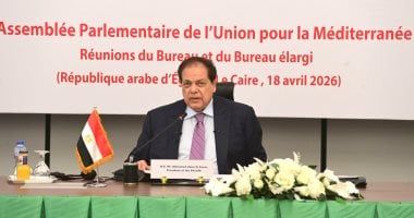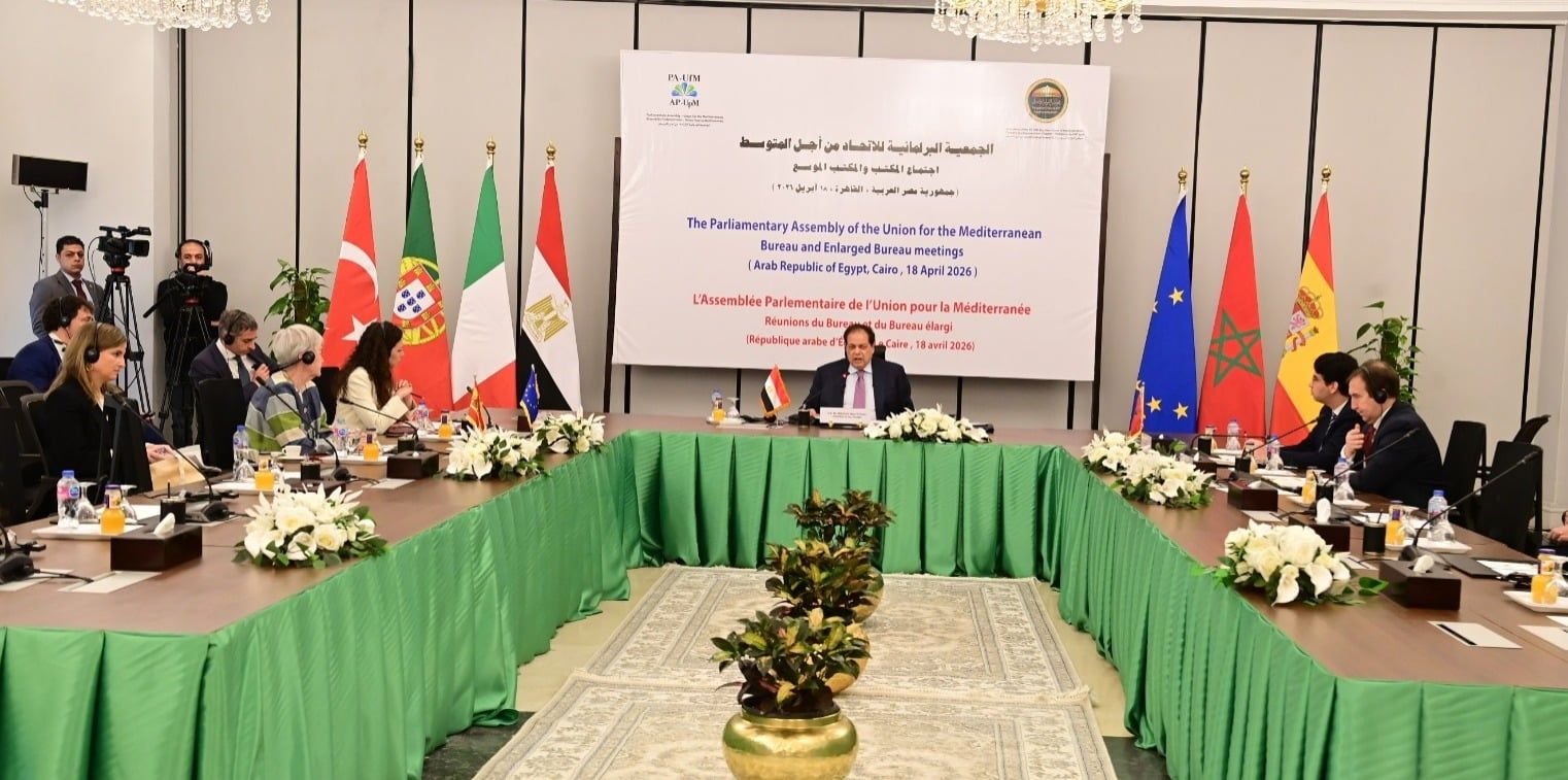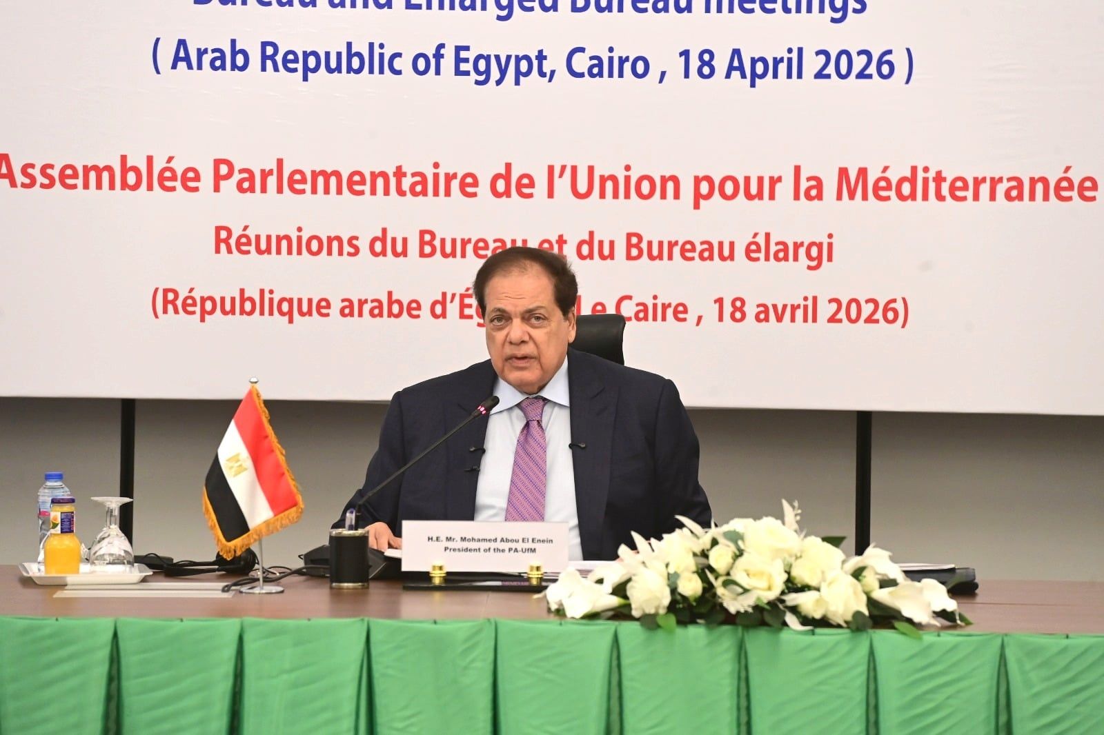 السبت، 18 أبريل 2026 12:54 مرحب النائب محمد أبو العينين، رئيس الجمعية البرلمانية للاتحاد من أجل المتوسط، بالمشاركين في اجتماع هيئة المكتب والمكتب المُوسّع لـ الجمعية البرلمانية للاتحاد من أجل المتوسط، الذي عُقد بمقر مجلس النواب في العاصمة الإدارية الجديدة.
