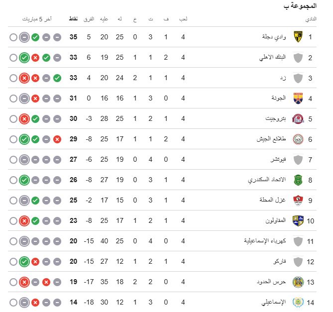 السبت، 18 أبريل 2026 12:13 ميتربع فريق وادي دجلة، على صدارة مجموعة الهبوط بالدوري المصري، وذلك قبل انطلاق منافسات الجولة الخامسة من المرحلة النهائية بالمجموعة الثانية، والتي تضم 14 فريقاً يتنافسون على أول 10 مقاعد، بينما تهبط 4 فرق إلى دوري المحترفين بنهاية الموسم.