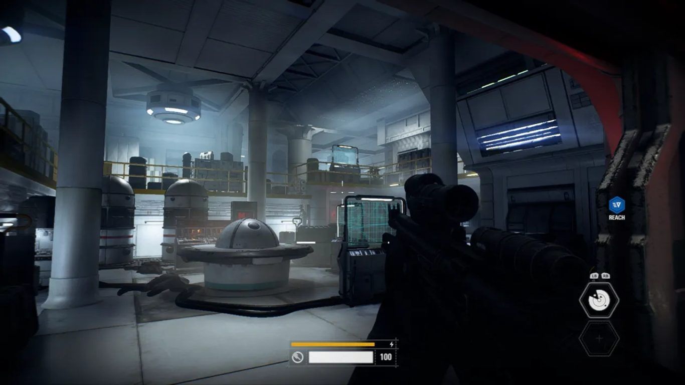 - قم بالقضاء على كل متمرد يظهر أمامك. واصل السير عبر الممر ثم اصعد الدرج عائدًا نحو الغرفة الكبيرة متعددة المستويات التي تم العثور فيها على العنصر القابل للجمع الثاني. ستجد مقاومة كبيرة من المتمردين هنا، استخدم الغطاء وتقدم بحذر شديد، ولا تتسرع في التحرك حتى في المستويات الصعبة، لأن الذكاء الاصطناعي في اللعبة ليس شديد العدوانية.