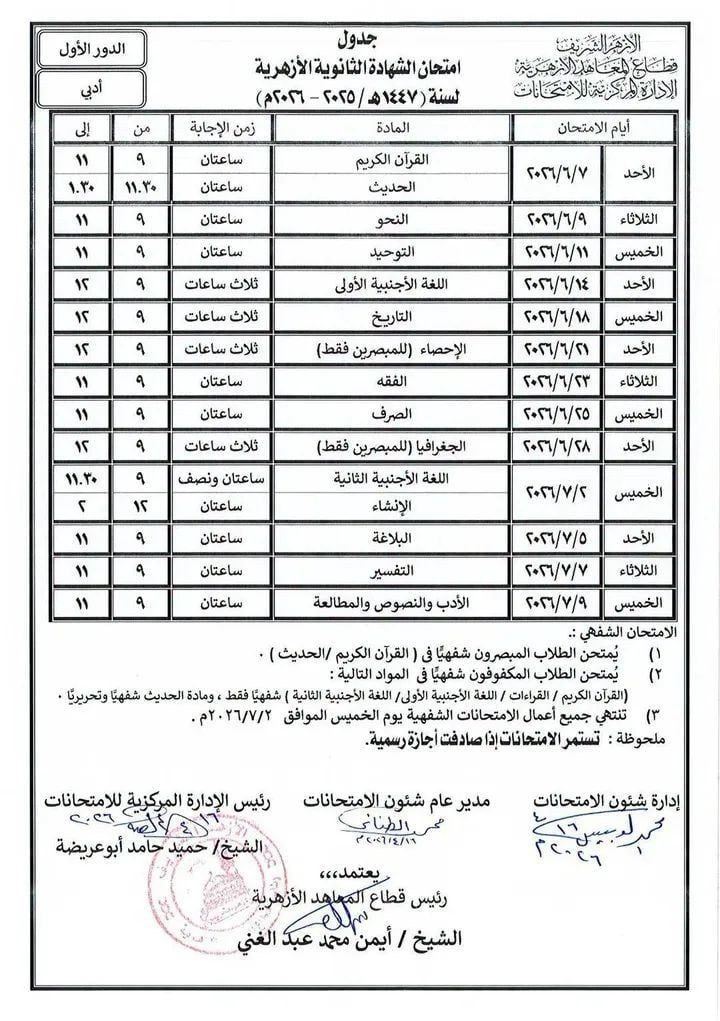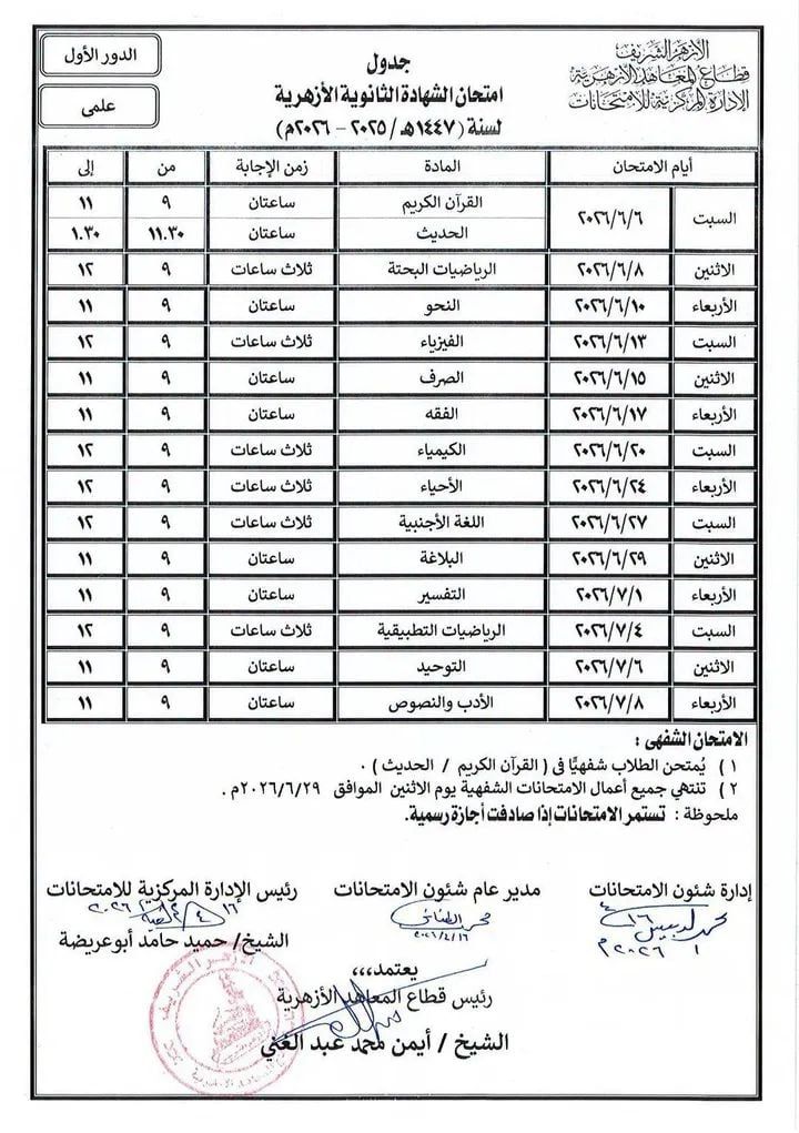 اعتمد اليوم السبت الشيخ أيمن عبد الغني، رئيس قطاع المعاهد الأزهرية، جداول امتحانات الشهادة الثانوية الأزهرية، والإعدادية (معاهد البعوث الاسلامية) للعام الدراسي ٢٠٢٦/٢٠٢٥م حيث قامت الإدارة المركزية للامتحانات برئاسة الشيخ حميد حامد ابو عريضة، بإعداد جداول الشهادة الثانوية الأزهرية لهذا العام