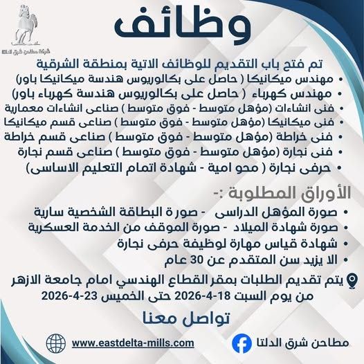 فرصة عمل مميزة تعلن شركة مطاحن شرق الدلتا (فرع الشرقية)عن فتح باب التقديم للوظائف التالية:
