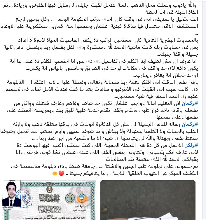 وأشار الطبيب قائلًا: "أنا عارف إن مش لطيف أبدًا أتكلم في تفاصيل زي دي، بس كلامى ممكن يشجع أي حد واقف في مكانه، أو حد حاسس باليأس ومش قادر يكمل، أو حد خجلان إنه يعافر، وفي نفس الوقت أفتكر نعمة ربنا سبحانه وتعالى وفضله عليا، لأنى أعتقد إن الدبلومة دي كانت سبب إني اتقبلت في الانترفيو وسافرت بعد ما كنت فقدت الأمل تمامًا في تخصص النساء، السفر فيه شبه مستحيل، لكن الأجمل من كل ده هي اللحظة الجميلة اللي كنت مستني أكتب فيها البوست ده، الحمد لله حصلت على دبلومة طب الجنين والأشعة من جامعة طنطا، ودي دبلومة متخصصة في الكشف المبكر عن العيوب الخلقية للأجنة".