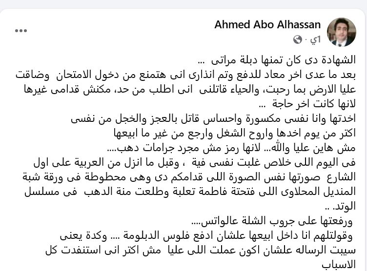 شارك الطبيب الشاب منشورًا عبر حسابه بموقع التواصل الاجتماعي فيسبوك، كتب فيه: "الشهادة دي كان تمنها دبلة مراتي.. بعد ما عدى آخر معاد للدفع وتم إنذاري إني هتمنع من دخول الامتحان، والحياء قاتلني إني أطلب من حد، مكنش قدامي غيرها لأنها كانت آخر حاجة، أخدتها وأنا نفسي مكسورة وإحساس قاتل بالعجز والخجل من نفسي، أكتر من يوم آخدها وأروح الشغل، وأرجع من غير ما أبيعها، مش هاين عليا والله، لأنها رمز، مش مجرد جرامات دهب".