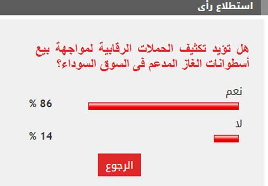 فى استطلاع للرأى طرحه "اليوم السابع" تحت عنوان هل تؤيد تكثيف الحملات الرقابية لمواجهة بيع أسطوانات الغاز المدعم فى السوق السوداء؟، أيد غالبية القراء تكثيف الحملات الرقابية لمواجهة بيع أسطوانات الغاز المدعم فى السوق السوداء.