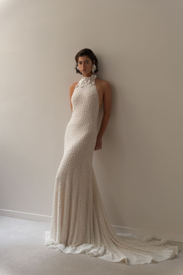 من الأكسسوارات إلى الأقمشة، أعيد ابتكار فساتين منفذة من اللؤلؤ الكلاسيكي للعرائس في أسبوع الموضة بنيويورك بأساليب عصرية وجديدة. وقد أعجبنا بشكل خاص استخدام ليهي هود Lihi Hod للؤلؤ في مجموعة 2027، بما في ذلك فستان Halter Neck مرصع باللؤلؤ الضخم أضفى لمسة جريئة وأنيقة في آن واحد. ويعتبر تصميم هالتر من التفاصيل المستوحاة من الطراز القديم التي تُحدث ضجةً على منصات عروض الأزياء، وهو تصميم الرقبة المفتوحة من الخلف ويُضفي المصممون عليه لمسةً راقيةً لحفلات الزفاف، بفضل إضافة الثنيات والتطريزات، مُقدمةً خياراً أنيقاً وعصرياً مع لمسةٍ من الماضي.