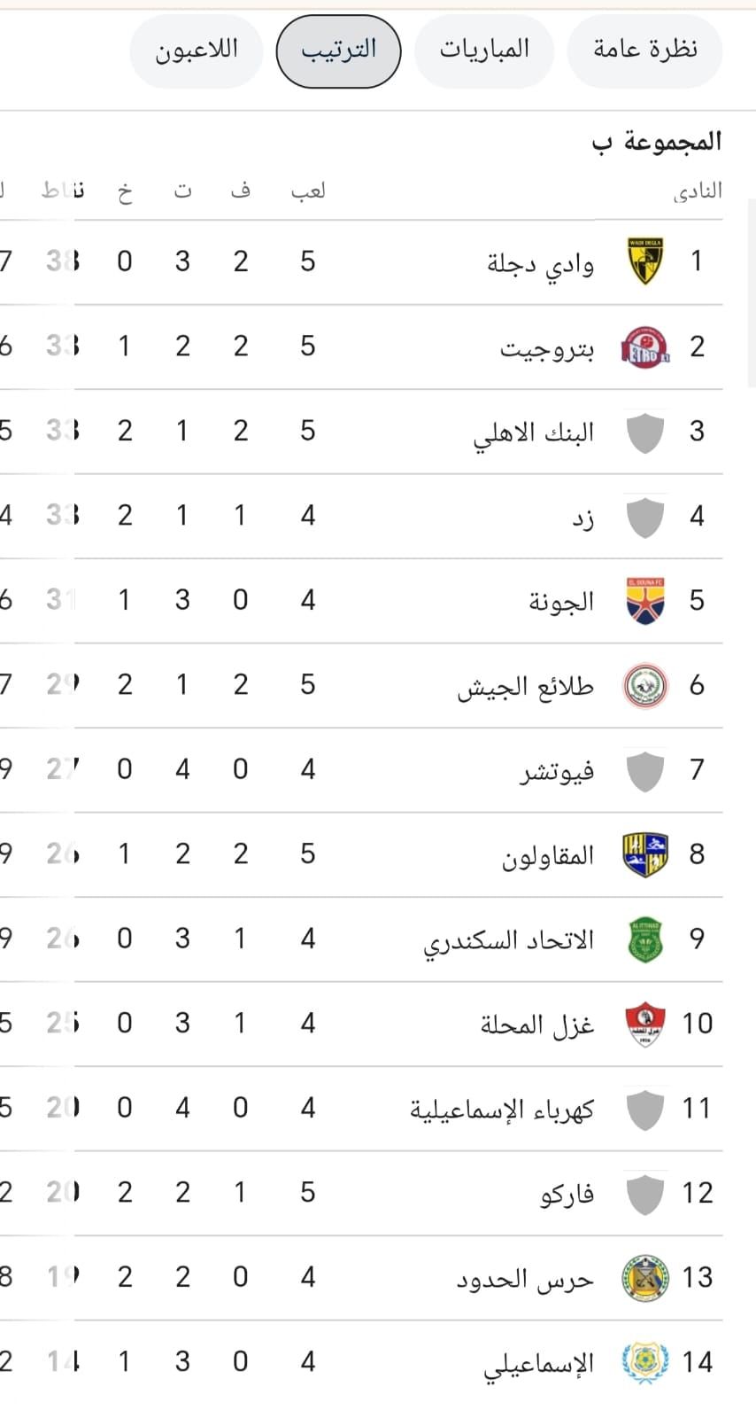 وادي دجلة يفوز على البنك الاهلىوتغلب فريق وادى دجلة في الجولة الخامسة من الدوري على البنك الأهلي بثنائية نظيفة ليرفع الغزلان رصيدهم إلى النقطة 38 في صدارة المجموعة بلا هزيمة حيث خاض دجلة في الدور الثاني 5 مباريات فاز خلالهم في مباراتين وتعادل في ثلاثة، فيما توقف رصيد البنك الاهلى عند النقطة 33 في المركز الثالث.