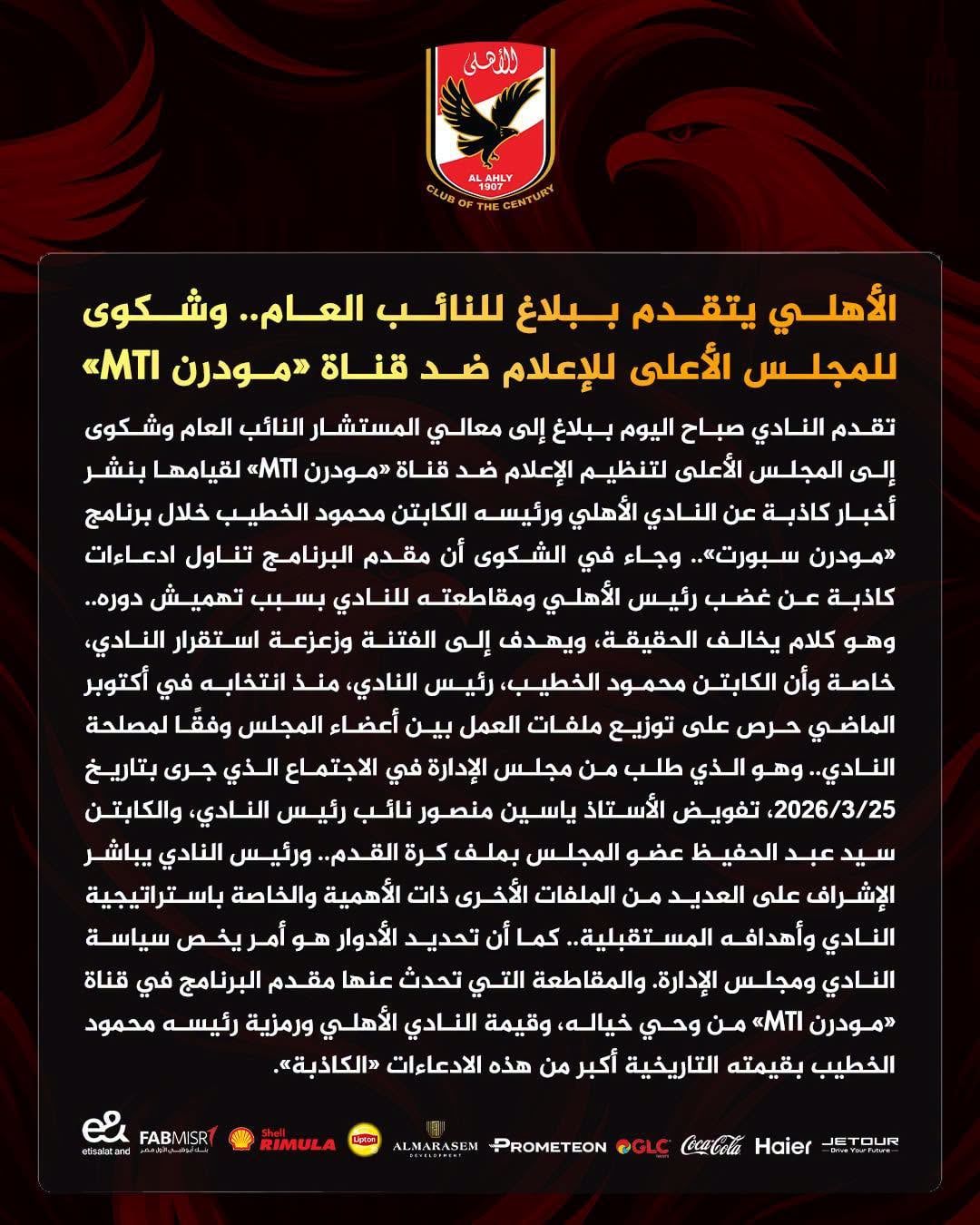 وجاء في الشكوى أن مقدم البرنامج تناول ادعاءات كاذبة عن غضب رئيس الأهلي ومقاطعته للنادي بسبب تهميش دوره.. وهو كلام يخالف الحقيقة، ويهدف إلى الفتنة وزعزعة استقرار النادي، خاصة وأن الكابتن محمود الخطيب، رئيس النادي، منذ انتخابه في أكتوبر الماضي حرص على توزيع ملفات العمل بين أعضاء المجلس وفقًا لمصلحة النادي.. وهو الذي طلب من مجلس الإدارة في الاجتماع الذي جرى بتاريخ 25/3/2026، تفويض الأستاذ ياسين منصور نائب رئيس النادي، والكابتن سيد عبد الحفيظ عضو المجلس بملف كرة القدم.. ورئيس النادي يباشر الإشراف على العديد من الملفات الأخرى ذات الأهمية والخاصة باستراتيجية النادي وأهدافه المستقبلية..