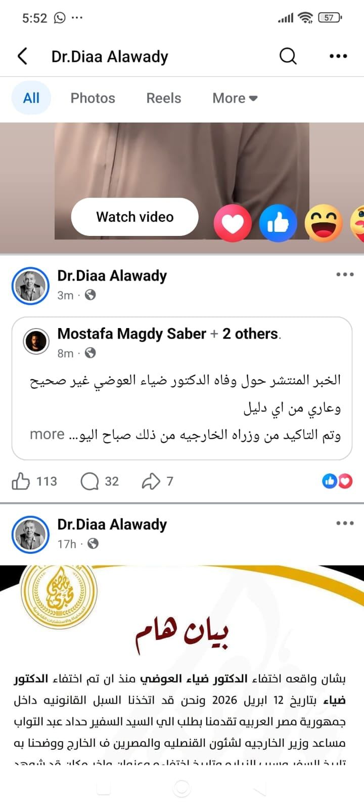 وذكرت الصفحة عبر منشور لها : الخبر المنتشر حول وفاه الدكتور ضياء العوضي غير صحيح وعاري من اي دليل